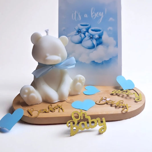 🧸 Beertjes Welkomstcadeau – Kaars op Houten Plankje bij Geboorte